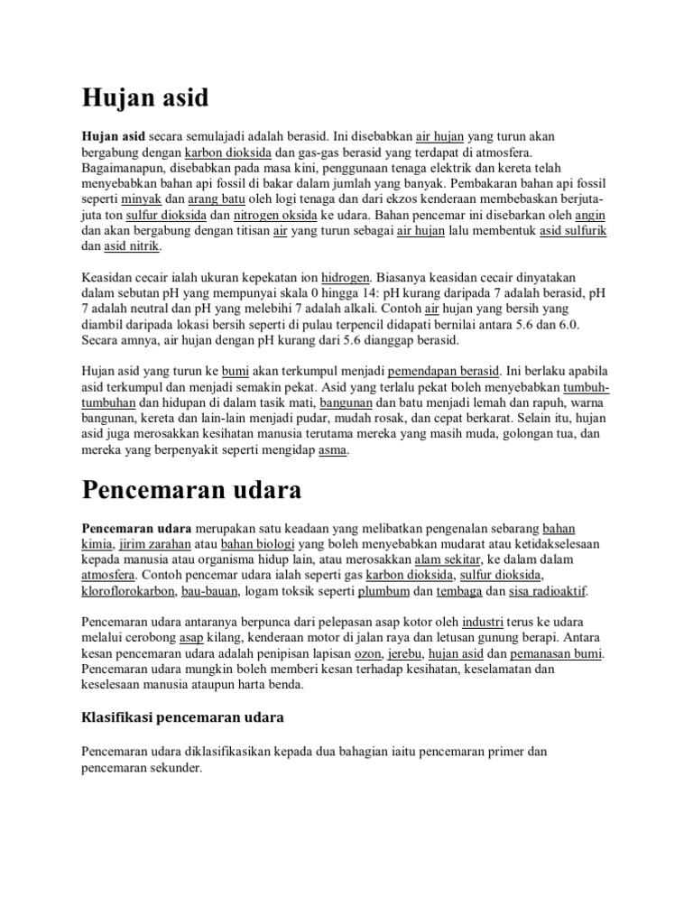 Kegiatan membakar:minyak + arang 2. Sulfur dan oksida nitrogen adalah bahagian normal kitaran geologi / alam sekitar. Apakah yang dimaksudkan dengan pemendakan asid? Untuk pengetahuan anda, hujan asid adalah satu fenomena di mana air hujan yang turun ke bumi adalah berasid. Download lagu punca punca hujan asid mp3 dapat kamu download secara gratis di metrolagu. Sejarah pengasidan bermula sejak beberapa ratus juta tahun dahulu. Air hujan secara semulajadi adalah berasid ini disebabkan oleh air hujan yang turun akan bergabung dengan karbon dioksida dan gas gas berasid yang. Terutamanya sulfur dioksida di atmosfera, dengan beberapa sumbangan daripada oksida nitrogen juga. Majoriti daripada mereka yang mengalami masalah ini boleh baik dengan. Apakah yang dikatakan sebagai hujan asid.? Nyatakan proses pembentukan hujan asid dapatkan maklumat daripada: Hujan asid terdiri daripada titisan air yang sangat berasid kerana pencemaran atmosfera, terutamanya jumlah sulfur dan nitrogen yang berlebihan yang dikeluarkan oleh kereta dan proses perindustrian. 0) adalah hujan yang lebih berasid daripada biasa (ph lebih besar daripada atau sama dengan 5 0).