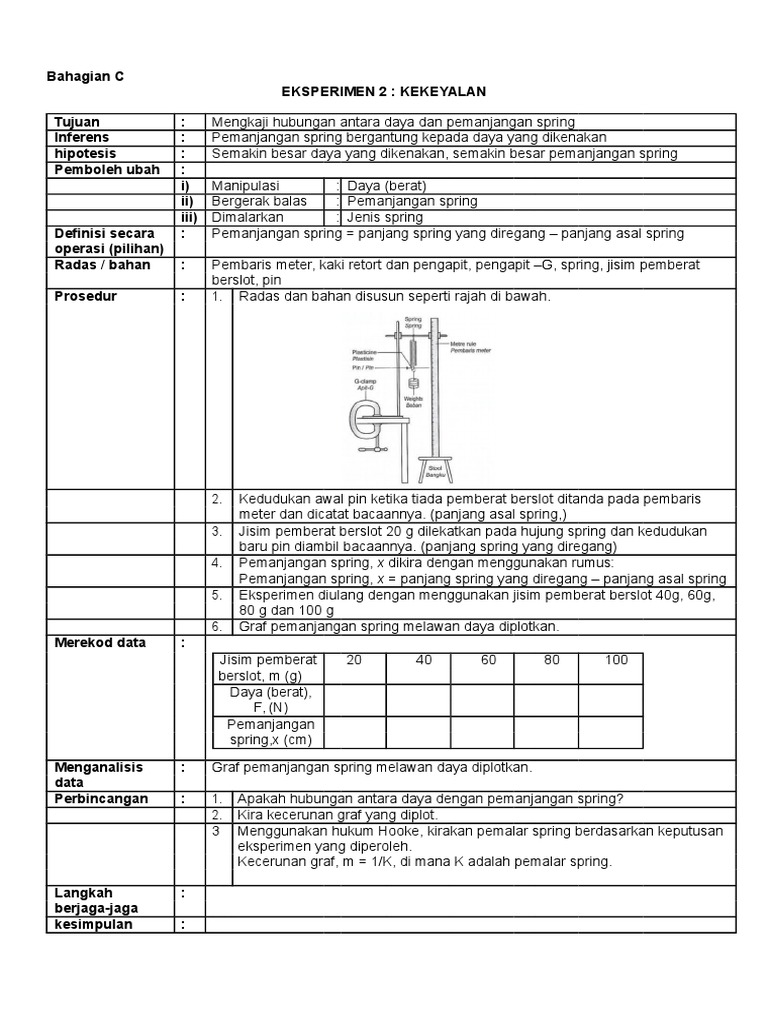 Pemanjangan spring bergantung kepada daya yang dikenakan. Menggunakan bahan dan radas berikut : Untuk mengkaji hubungan di antara daya dan pemanjangan spring. Sebut saja kejadian $a$ dan bukan $a$ (kita pembahasan. Ini adalah eksperimen 1 untuk mengkaji kekonduksian elektrik terhadap logam dan bukan logam.