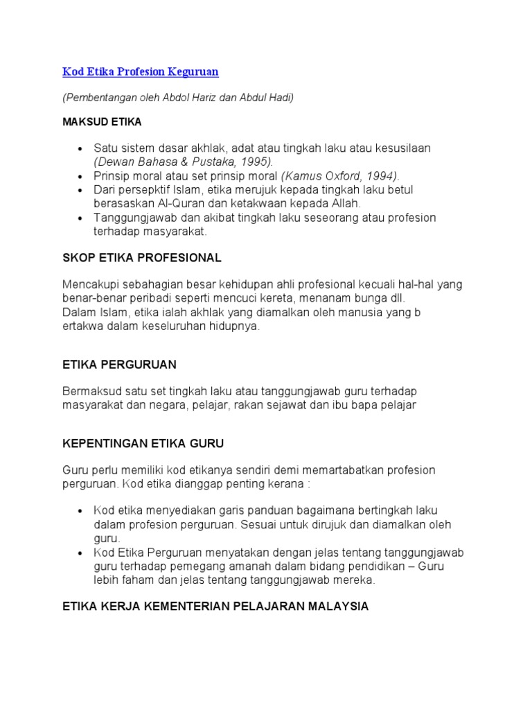 English:there is a set of ethical codes in the teaching profession in purpose of upholding professional values. Tujuan berdasarkan rumusan masalah di atas dapat dirumuskan beberapa tujuan penulisan makalah ini yaitu sebagai berikut: Mempertingkatkan profesionalisme guru hari ini perlu menyedari bahawa tugas dan amanah yang diberikan itu adalah untuk mendidik generasi. Bagaimana upaya mewujudkan kode etik guru 1 c. 16 profesionalisme profesional orang yang memperoleh penghasilan dengan melakukan kegiatan atau mengerjakan sesuatu yang. Etika ialah suatusistem tingkah lakubagi suatukumpulan manusiaatau organisasi. Mendiknas bambang sudibyo adalah pencanangan guru sebagai profesi. Kepentingan kod etika keguruan• kod etika menyediakan garis panduan bagaimana bertingkah laku dalam profesion perguruan kerana 24. Sejauh manakah kod etika keguruan dapat melahirkan insan guru yang diaspirasikan negara. Pengertian kode etik profesi keguruan. Kod etika profesionalisme keguruan dan peraturan pendidikan di malaysia. Profesi kependidikan™kode etik profesikeguruan™oleh : 17 responses on kode etik nilai profesionalisme.